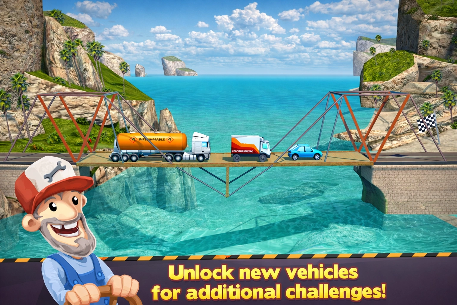 The Bridge Constructor MOD APK removes the biggest hurdle in the game: the budget cap. In the standard version, every level restricts how much money you can spend on materials, often forcing you to cut corners or build weaker structures. This modified version provides an Unlimited Budget, allowing you to use as much steel, concrete, and cable as necessary to build the strongest bridge possible. Additionally, all premium DLCs, including "SlopeMania" and "Trains," are fully unlocked, giving you access to dozens of extra levels and new gameplay mechanics without any purchase.